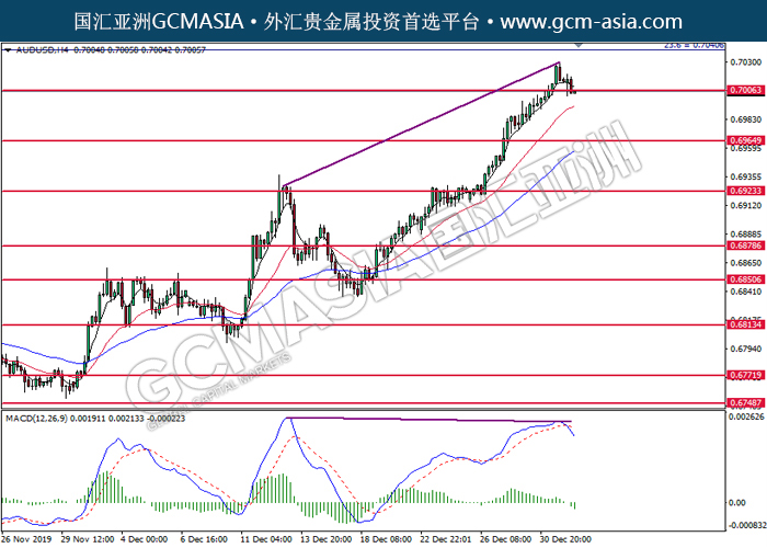 20200102 AUDUSD-午间 by keyk | Jan 2, 2020 | 澳元兑美元 | 0 comments GCMAsia - AUDUSD AUDUSD 2020-01-02 AUDUSD, H4: 澳美突破后持续下行。MACD已形成死叉,中期可关注空头为主。上方关注0.7005压力和0.7040压力,下方关注0.6965支撑和0.6925支撑。