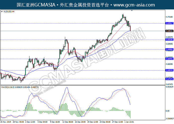 20200103 AUDUSD-午间 by keyk | Jan 3, 2020 | 澳元兑美元 | 0 comments GCMAsia - AUDUSD AUDUSD 2020-01-03 AUDUSD, H4: 澳美高位承压回落。MACD东呢个持续略减,中期继续看空为主。上方关注0.6990压力和0.7040压力,下方关注0.6925支撑和0.6885支撑。