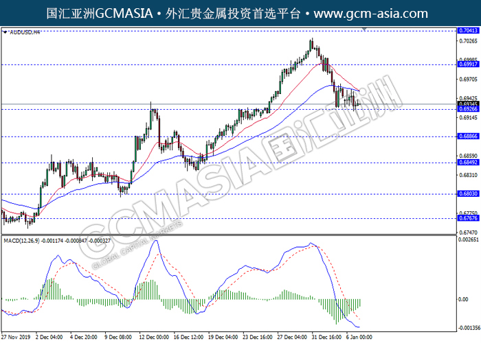 AUDUSD, H4: 澳美震荡下行,目前测试靠近前期支撑。然而,MACD空头动能有所略减,短期关注多头反弹走势为主。上方关注0.6990压力和0.7040压力,下方关注0.6925支撑和0.6885支撑。