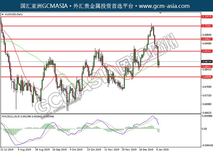AUDUSD, Daily: 澳美低位反弹。然而,MACD空头动能有所略增,短期关注技术性回调。上方关注0.6915压力和0.6965压力,下方关注0.6850支撑和0.6810支撑。
