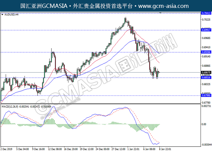 AUDUSD, H4: 澳美空头排列,目前测试靠近前期支撑。然而,MACD开始形成金叉,空头动能有所略减,短期关注多头反弹走势为主。上方关注0.6925压力和0.6990压力,下方关注0.6850支撑和0.6800支撑。