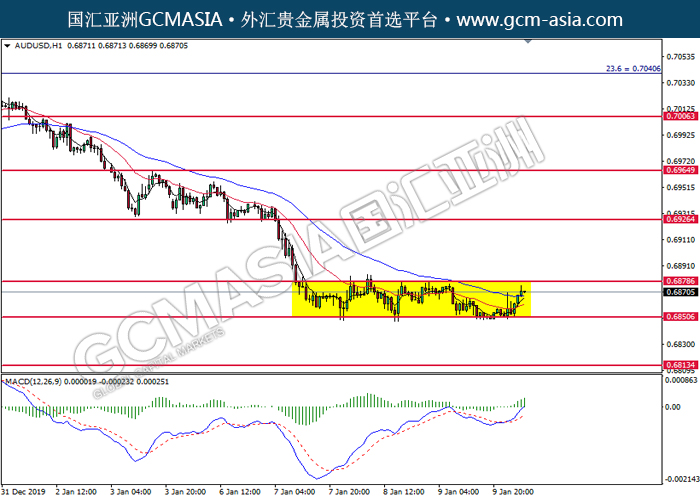 AUDUSD, H1: 澳美低位反弹,目前测试压力位。MACD多头动能略增,若突破可关注多头为主。上方关注0.6880压力和0.6925压力,下方关注0.6850支撑和0.6815支撑。