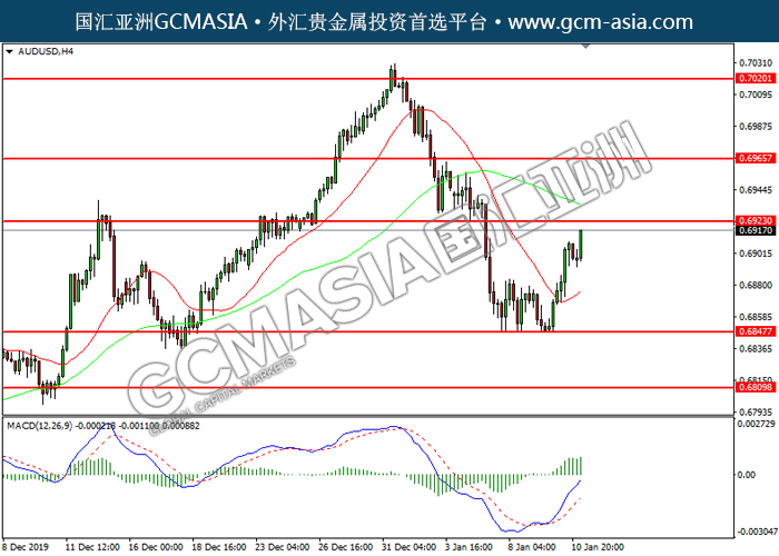 AUDUSD, H4: 澳美多头排列,目前靠近前期压力。MACD多头动能略增,若突破可关注多头为主。上方关注0.6925压力和0.6965压力,下方关注0.6845支撑和0.6810支撑。