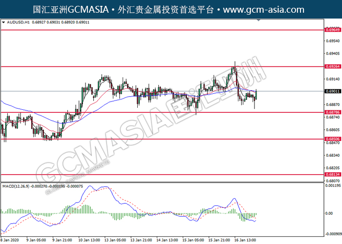 AUDUSD,H1:澳美低位反弹,目前测试20(红)和50(蓝)均线。MACD转向多头,动能转强,若突破可继续看多。上方关注0.6925压力和0.6965压力,下方关注0.6880支撑和0.6850支撑。