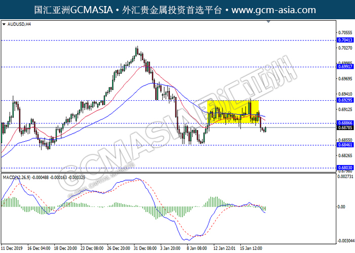 AUDUSD,H4:澳美突破前期支撑,震荡下行。MACD形成死叉,动能略减,中期继续看空为主。上方关注0.6885压力和0.6930压力,下方关注0.6845支撑和0.6805支撑。