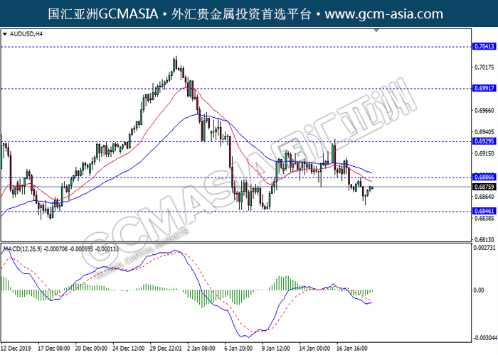 20200121 AUDUSD by keyk | Jan 21, 2020 | 澳元兑美元 | 0 comments GCMAsia - AUDUSD AUDUSD 2020-01-21 AUDUSD,H4:澳美低位反弹。MACD多头偏强,空头动能略减,短期继续关注多头反弹为主。上方关注0.6885压力和0.6930压力,下方关注0.6845支撑和0.6805支撑。