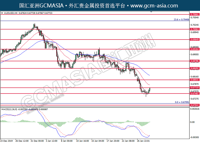 AUDUSD,H4:澳美低位反弹,目前测试着压力位。MACD空头动能有所略减,若突破可关注多头势力为主。上方关注0.6770压力和0.6805压力,下方关注0.6750支撑和0.6710支撑。