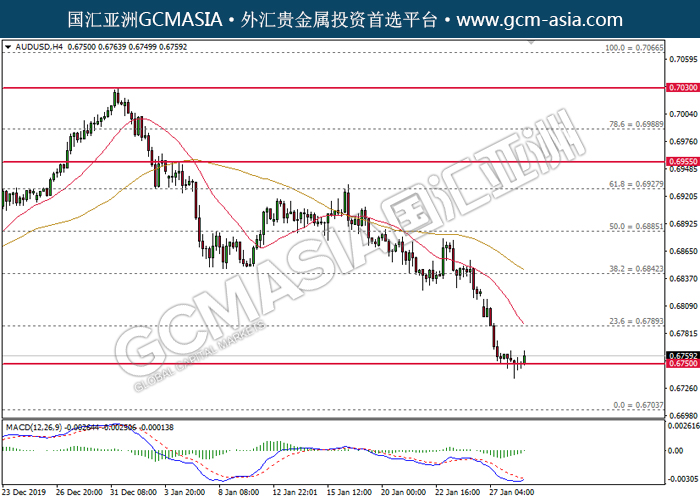 20200129 AUDUSD by willy | Jan 28, 2020 | 澳元兑美元 | 0 comments GCMAsia - AUDUSD AUDUSD 2020-01-29 AUDUSD,H4:澳美低位反弹。MACD空头动能有所略减,短期关注多头势力为主。上方关注0.6790压力和0.6840压力,下方关注0.6750支撑和0.6705支撑。