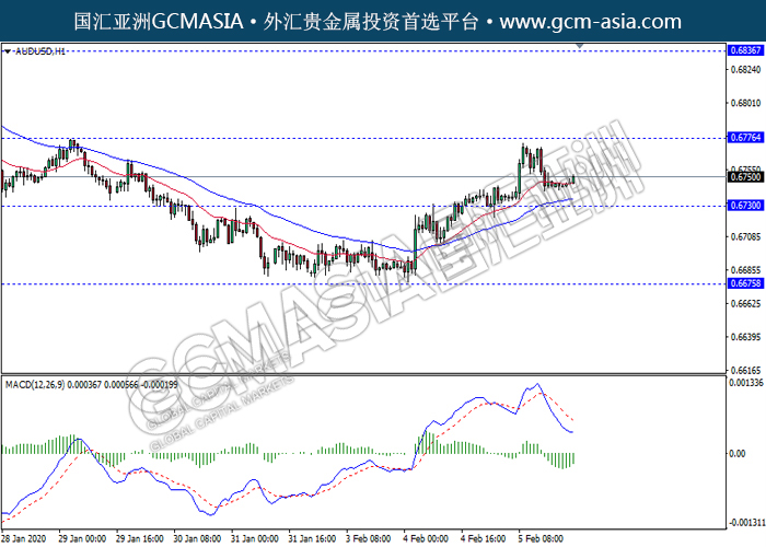 AUDUSD,H1:澳美触20均线 (红色) 后反弹。MACD空头动能有所略减,短期关注多头势力为主。上方关注0.6775压力和0.6835压力,下方关注0.6730支撑和0.6675支撑。