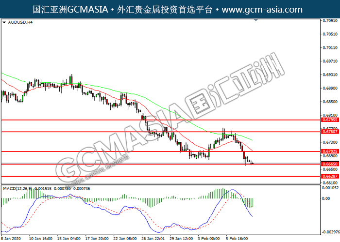 AUDUSD,H4:澳美震荡下行,目前靠近前期支撑。然而,MACD空头动能略减,短期可关注技术性回调。上方关注0.6705压力和0.6760压力,下方关注0.6665支撑和0.6630支撑。
