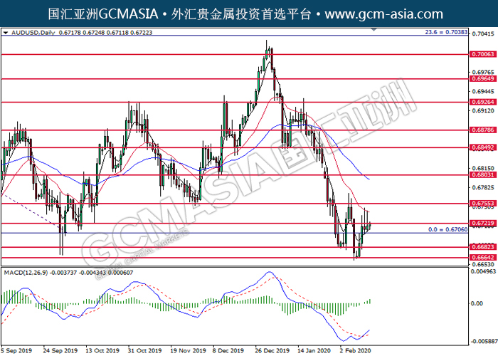 AUDUSD,Daily:澳美震荡上行,目前测试着压力位。MACD多头动能有所略增,若突破可持续关注多头为主。上方关注0.6720压力和0.6755压力,下方关注0.6705支撑和0.6680支撑。