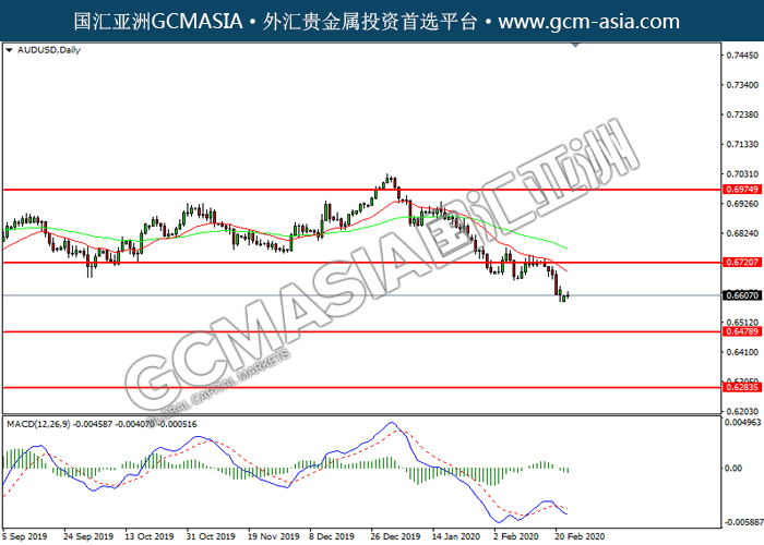 20200224 AUDUSD-午间 by willy | Feb 24, 2020 | 澳元兑美元 | 0 comments GCMAsia - AUDUSD AUDUSD 2020-02-24 AUDUSD, Daily:澳美震荡下行。MACD已形成死叉,动能转弱,短期关注空头为主。上方关注0.6720压力和0.6975压力,下方关注0.6480支撑和0.6285支撑。