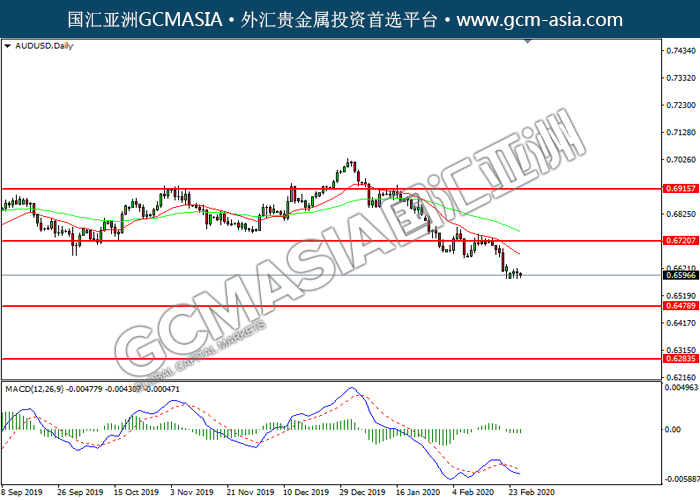 20200226 AUDUSD-午间 by keyk | Feb 26, 2020 | 澳元兑美元 | 0 comments GCMAsia - AUDUSD AUDUSD 2020-02-26 AUDUSD, Daily: 澳美震荡下行。MACD显示空头信号,短期可关注空头为主。上方关注0.6720压力和0.6915压力,下方关注0.6480支撑和0.6285支撑。
