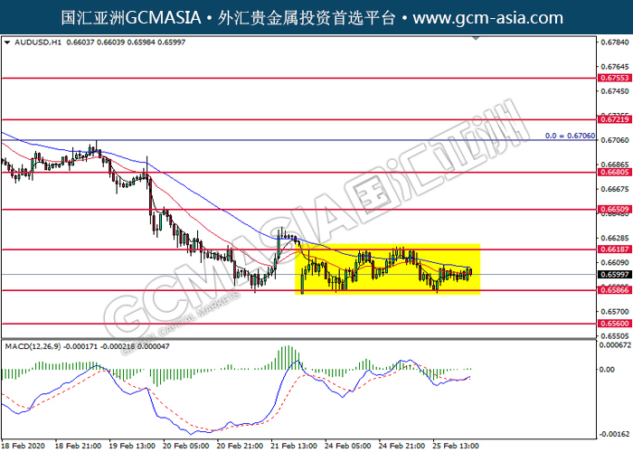20200226 AUDUSD by skylow | Feb 26, 2020 | 澳元兑美元 | 0 comments GCMAsia - AUDUSD AUDUSD 2020-02-26 AUDUSD, H1: 澳美震荡于狭窄区间中。MACD显示多头信号,短期可关注多头为主。上方关注0.6620压力和0.6650压力,下方关注0.6585支撑和0.6560支撑。