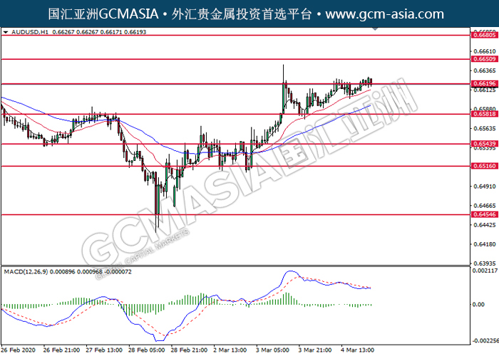 20200305 AUDUSD by skylow | Mar 5, 2020 | 澳元兑美元 | 0 comments GCMAsia - AUDUSD AUDUSD 2020-03-05 AUDUSD,H1:澳美突破后持续上行。MACD空头动能有所略减,短期关注多头势力。上方关注0.6650压力和0.6680压力,下方关注0.6620支撑和0.6580支撑。