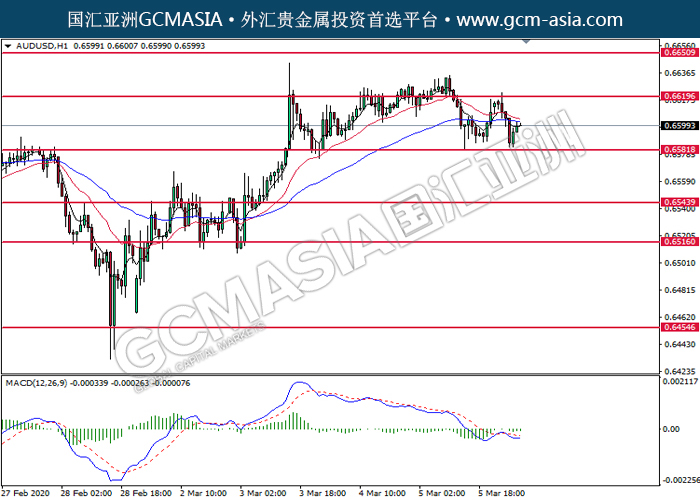 20200306 AUDUSD-午间 by keyk | Mar 6, 2020 | 澳元兑美元 | 0 comments GCMAsia - AUDUSD AUDUSD 2020-03-06 AUDUSD, H1:澳美触底反弹上行。MACD空头动能略减,短期继续关注多头反弹为主。上方关注0.6620压力和0.6650压力,下方关注0.6580支撑和0.6545支撑。