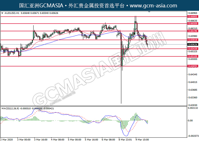 20200310 AUDUSD-午间 by willy | Mar 10, 2020 | 澳元兑美元 | 0 comments GCMAsia - AUDUSD AUDUSD 2020-03-10 AUDUSD, H1:澳美突破后持续下行。MACD空头动能略增,短期可关注空头走势为主。上方关注0.6580压力和0.6620压力,下方关注0.6545支撑和0.6510支撑。