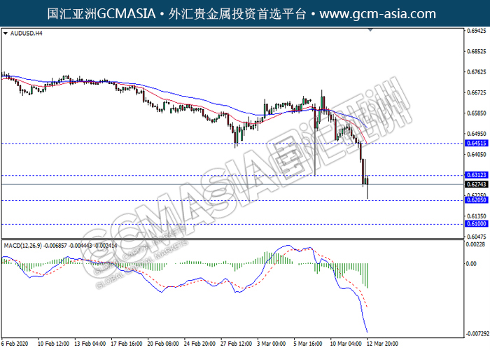 AUDUSD, H4:澳美突破前期支撑,空头排列。MACD动能持续略减,短期继续关注空头为主。上方关注0.6310压力和0.6450压力,下方关注0.6205支撑和0.6100支撑。