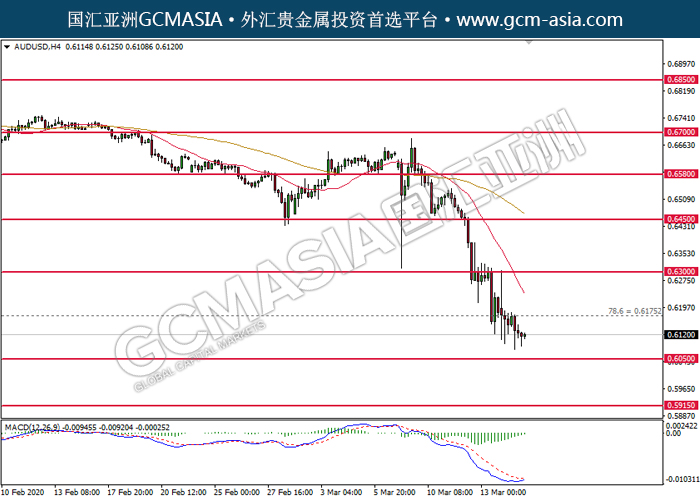 20200317 AUDUSD by willy | Mar 16, 2020 | 澳元兑美元 | 0 comments GCMAsia - AUDUSD AUDUSD 2020-03-17 AUDUSD,H4:澳美低位反弹。MACD空头动能有所略减,短期关注多头势力。上方关注0.6175压力和0.6300压力,下方关注0.6050支撑和0.5915支撑。