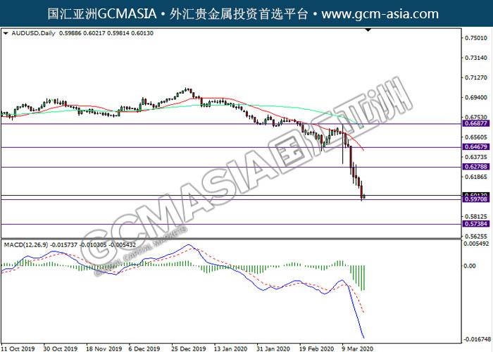 AUDUSD,Daily:澳美空头排列,目前测试前期支撑。然而,MACD空头动能有所略减,短期关注技术性多头反弹为主。上方关注0.6280压力和0.6465压力,下方关注0.5970支撑和0.5740支撑。