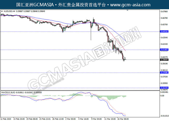 AUDUSD,H4:澳美突破前期支持,空头排列。然而,MACD空头动能有所略减,短期关注技术性多头反弹为主。上方关注0.6150压力和0.6450压力,下方关注0.5770支撑和0.5515支撑。