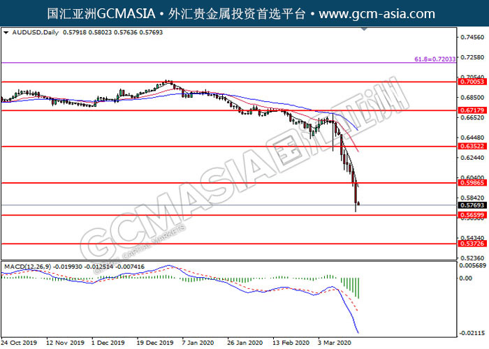 20200319 AUDUSD by skylow | Mar 19, 2020 | 澳元兑美元 | 0 comments GCMAsia - AUDUSD AUDUSD 2020-03-19 AUDUSD,Daily:澳美突破后持续下行。MACD空头动能有略增,短期关注空头走势为主。上方关注0.5985压力和0.6350压力,下方关注0.5660支撑和0.5375支撑。
