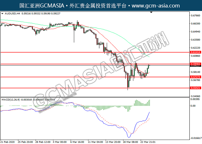 AUDUSD, H4:澳美震荡上行,目前测试前期压力。MACD多头动能略增,若突破可关注多头为主。上方关注0.5945压力和0.6140压力,下方关注0.5725支撑和0.5540支撑。