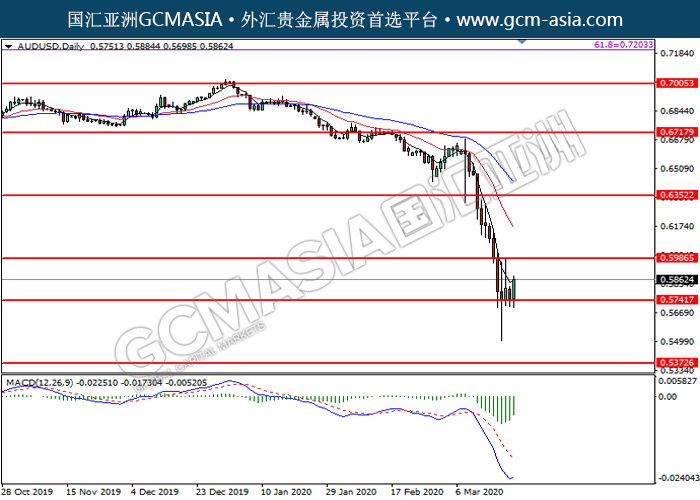 AUDUSD,Daily:澳美低位反弹。MACD空头动能有略减,短期关注多头走势为主。上方关注0.5985压力和0.6350压力,下方关注0.5740支撑和0.5375支撑。