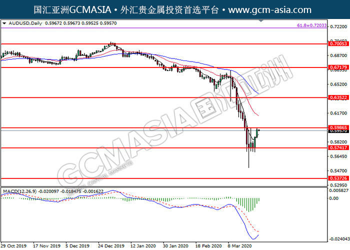 AUDUSD,Daily:澳美低位反弹,目前测试着压力位。MACD空头动能有略减,若突破可关注多头走势为主。上方关注0.5985压力和0.6350压力,下方关注0.5740支撑和0.5375支撑。
