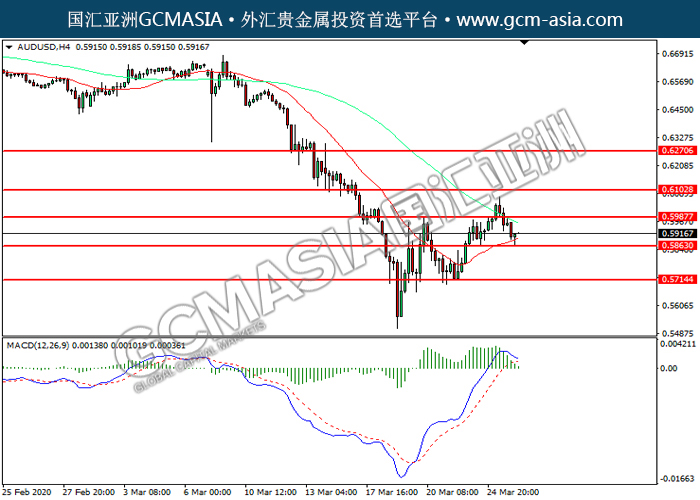AUDUSD,H4:澳美高位承压后回落,目前测试前期支撑。MACD多头动能有略减,若下破可关注空头走势为主。上方关注0.5985压力和0.6105压力,下方关注0.5865支撑和0.5715支撑。