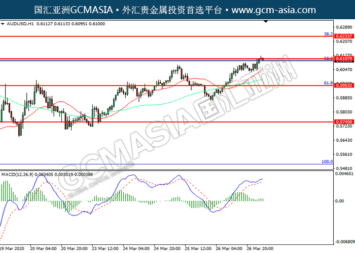 AUDUSD,H1:澳美震荡上行,目前测试着压力位。然而,MACD多头动能有略减,短期可关注技术性回调。上方关注0.6110压力和0.6235压力,下方关注0.5955支撑和0.5745支撑。
