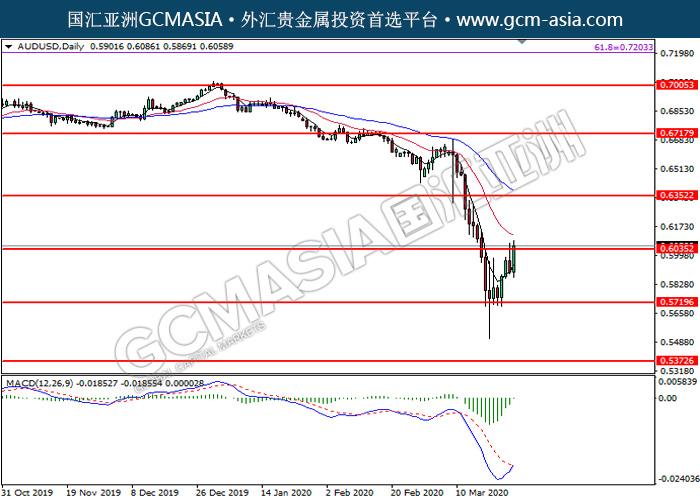 AUDUSD,Daily:澳美震荡上行,目前测试着压力位。MACD空头动能有略减,若突破可关注多头走势为主。上方关注0.6035压力和0.6350压力,下方关注0.5720支撑和0.5375支撑。