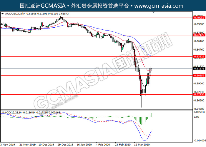20200330 AUDUSD by willy | Mar 30, 2020 | 澳元兑美元 | 0 comments GCMAsia - AUDUSD AUDUSD 2020-03-30 AUDUSD,Daily:澳美突破后持续上行。MACD多头动能有略增,短期关注多头走势为主。上方关注0.6350压力和0.6720压力,下方关注0.6035支撑和0.5720支撑。