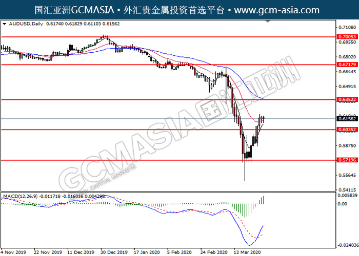 20200331 AUDUSD by willy | Mar 31, 2020 | 澳元兑美元 | 0 comments GCMAsia - AUDUSD AUDUSD 2020-03-31 AUDUSD,Daily:澳美突破后持续上行。MACD多头动能有略增,中期关注多头走势为主。上方关注0.6350压力和0.6720压力,下方关注0.6035支撑和0.5720支撑。