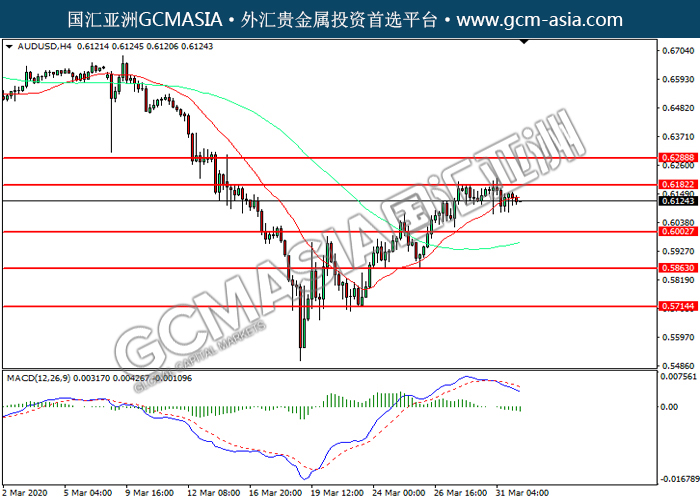 20200401 AUDUSD-午间 by keyk | Apr 1, 2020 | 澳元兑美元 | 0 comments GCMAsia - AUDUSD a 2020-04-01 AUDUSD,H4:澳美震荡下行。MACD空头动能略增,短期可关注空头为主。上方关注0.6180压力和0.6290压力,下方关注0.6005支撑和0.5865支撑。
