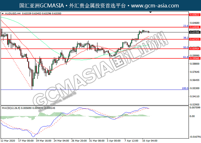 AUDUSD,H4:澳美突破后持续上行,目前靠近前期压力。然而,MACD多头动能略减,短期可关注技术性回调。上方关注0.6405压力和0.6580压力,下方关注0.6230支撑和0.6095支撑。