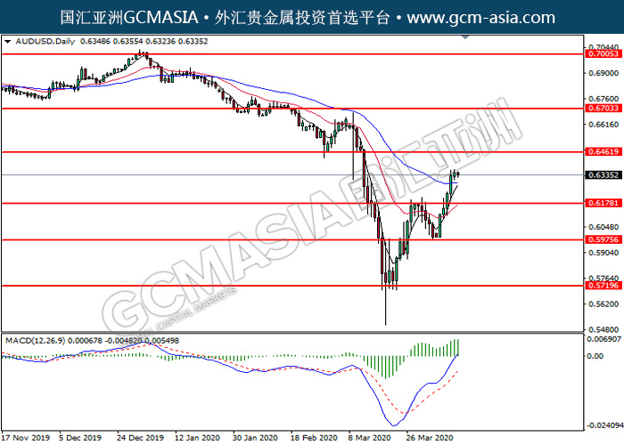AUDUSD,Daily:澳美突破后持续上行。MACD多头动能略增,中期可持续关注多头走势为主。上方关注0.6460压力和0.6705压力,下方关注0.6180支撑和0.5975支撑。