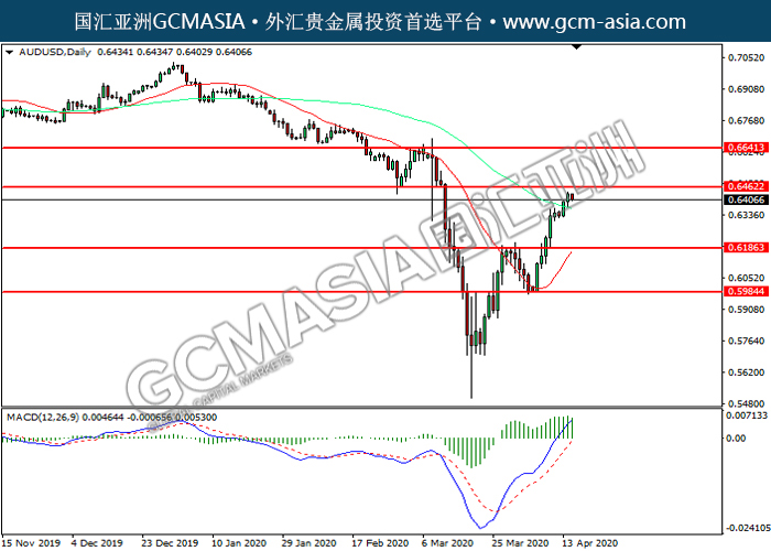 AUDUSD,Daily:澳美突破后持续上行,目前测试前期压力。然而,MACD多头动能略减,短期可关注技术性回调。上方关注0.6460压力和0.6640压力,下方关注0.6185支撑和0.5985支撑。