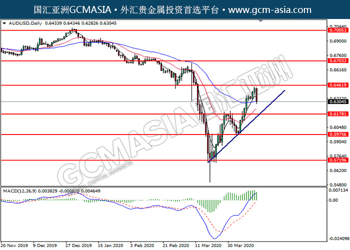 AUDUSD,Daily:澳美高位成压后回落。MACD转向空头,动能略减,中期可关注空头走势为主。上方关注0.6460压力和0.6705压力,下方关注0.6180支撑和0.5975支撑。
