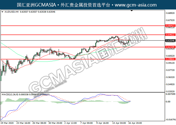 20200417 AUDUSD-午间 by keyk | Apr 17, 2020 | 澳元兑美元 | 0 comments GCMAsia - AUDUSD AUDUSD 2020-04-17 AUDUSD,H4:澳美震荡上行。MACD空头动能略减,短期可持续关注多头为主。上方关注0.6460压力和0.6640压力,下方关注0.6220支撑和0.5985支撑。