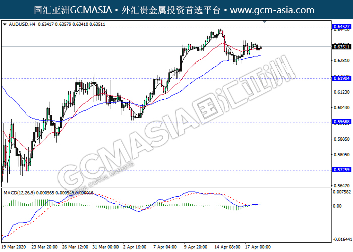 AUDUSD,H4:澳美震荡盘整靠近平均线。由于MACD缺乏清晰方向和动能,建议等更明确的信号出现才进入市场,短期可持续关注空头为主。上方关注0.6460压力和0.6660压力,下方关注0.6190支撑和0.5970支撑。