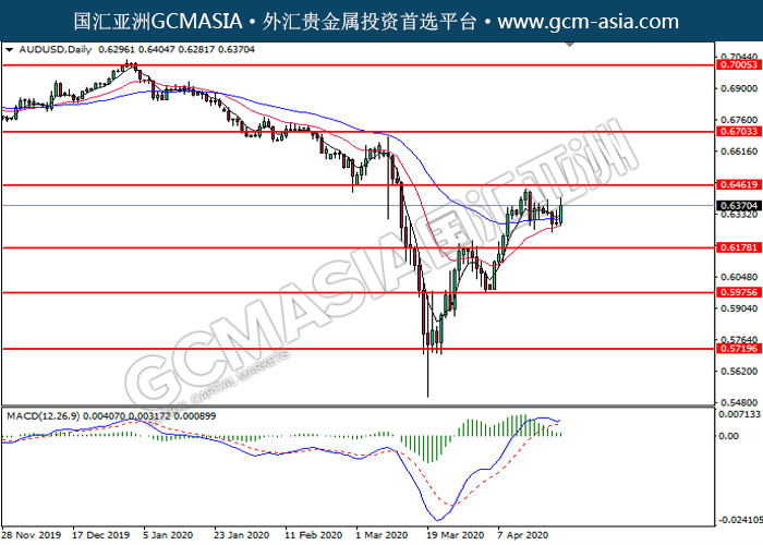 AUDUSD,Daily:澳美触及20均线(红)反弹。MACD转向多头,动能偏强,中期可关注多头为主。上方关注0.6460压力和0.6705压力,下方关注0.6180支撑和0.5975支撑。