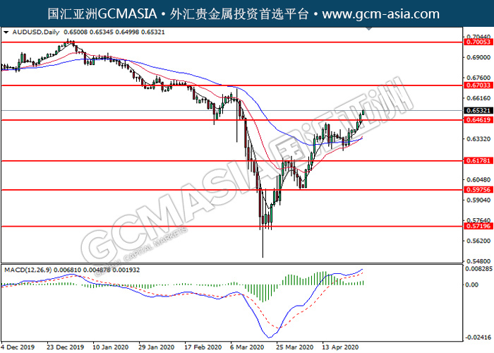 AUDUSD,Daily:澳美突破后持续上行。MACD转向多头,动能偏强,中期可关注多头为主。上方关注0.6705压力和0.7005压力,下方关注0.6460支撑和0.6180支撑。