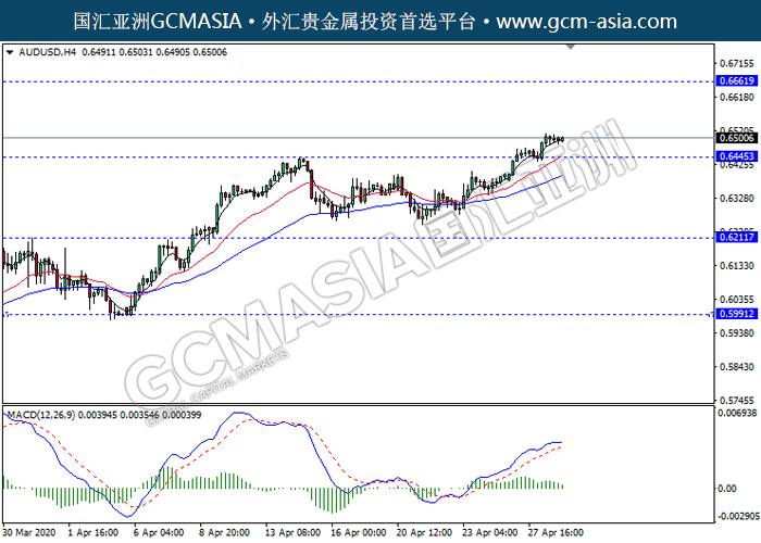 AUDUSD,H4:澳美突破前期压力,震荡上行。然而,MACD多头动能有所略减,短期关注空头回调趋势为主。上方关注0.6660压力和0.6770压力,下方关注0.6445支撑和0.6210支撑。