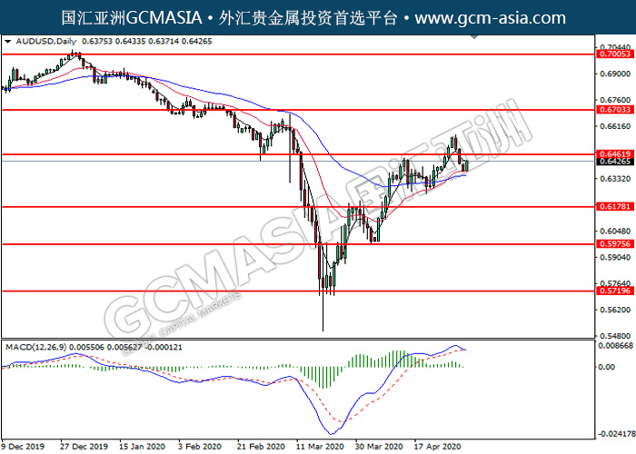 AUDUSD,Daily:澳美触及20均线(红)后反弹。然而,MACD形成死叉,动能略减,短期可关注空头回调为主。上方关注0.6460压力和0.6705压力,下方关注0.6180支撑和0.5975支撑。