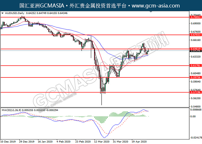 AUDUSD,Daily:澳美触及20均线(红)后反弹。由于MACD并没有显示任何信号,建议等到更多信号出现后再进入市场。上方关注0.6460压力和0.6705压力,下方关注0.6180支撑和0.5975支撑。