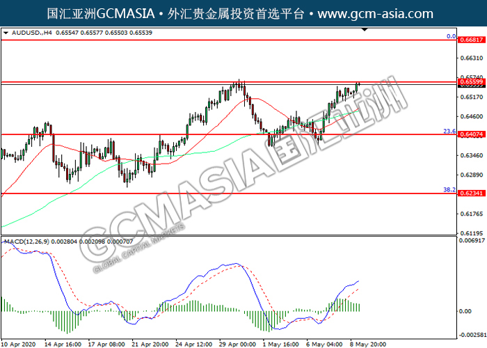 AUDUSD,H4:澳美震荡上行,目前测试前期压力。然而,MACD多头动能略减,短期可关注技术性回调为主。上方关注0.6560压力和0.6680压力,下方关注0.6405支撑和0.6235支撑。