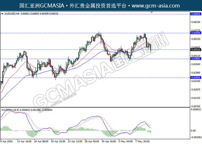 20200512 AUDUSD-午间 by keyk | May 12, 2020 | 澳元兑美元 | 0 comments GCMAsia - AUDUSD AUDUSD 2020-05-12 AUDUSD,H4:澳美高位承压回落。MACD形成死叉,动能略减,短期继续看空为主。上方关注0.6560压力和0.6685压力,下方关注0.6390支撑和0.6265支撑。