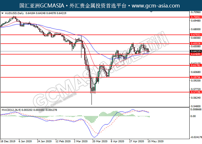 20200518 AUDUSD by willy | May 18, 2020 | 澳元兑美元 | 0 comments GCMAsia - AUDUSD AUDUSD 2020-05-18 AUDUSD,Daily:澳美高位承压后回落。MACD显示空头信号,中期可关注空头走势为主。上方关注0.6555压力和0.6705压力,下方关注0.6370支撑和0.6180支撑。