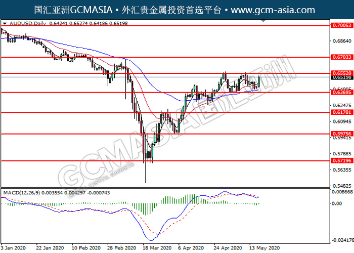 AUDUSD,Daily:澳美地位反弹。MACD显示多头信号,中期可关注多头走势为主。上方关注0.6555压力和0.6705压力,下方关注0.6370支撑和0.6180支撑。